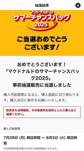 2025年7月24日(木)マクドナルドの夏の福袋「サマーチャンスバッグ2025」の当選者発表! 夏の福袋(税込3,500円)「サマーチャンスバッグ2025」の内容は、「ビッグマックファン」「コカ・コーラ タンブラー」「マクドナルドキャラクタータオル」「チキンマッ…